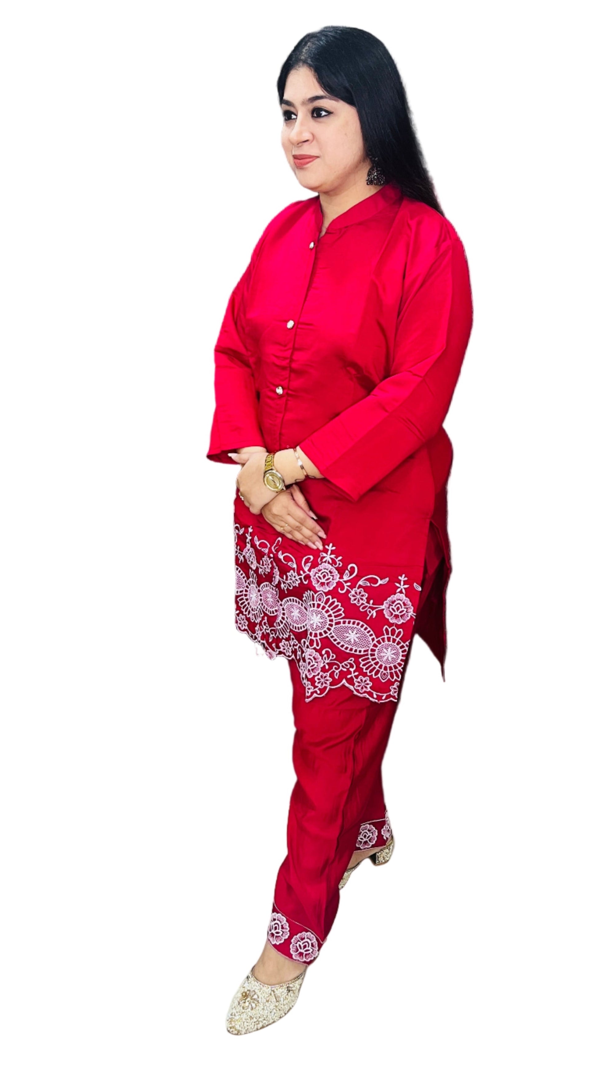 The Pink Embroidery Elegance Coord Set crafted from premium roman silk offers a refined blend of comfort and luxury. Featuring intricate embroidery, this set elevates your wardrobe with a touch of sophistication. Its breathable fabric ensures all-day comfort, making it perfect for formal occasions or stylish gatherings. Designed for elegance and ease, this coordinated ensemble embodies timeless charm and expert craftsmanship.