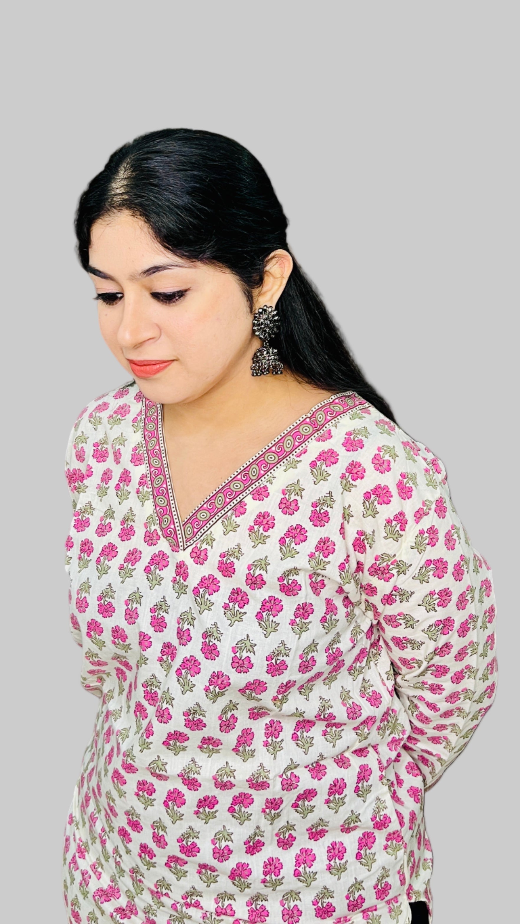 The Rosy Bloom Short Kurti combines elegant floral motifs with a modern silhouette, offering a versatile piece ideal for casual and semi-formal occasions. Crafted with breathable fabric, it ensures comfort throughout the day while its tailored fit enhances your natural shape. Perfectly styled with jeans or leggings, this kurti provides both style and ease for your daily wardrobe.