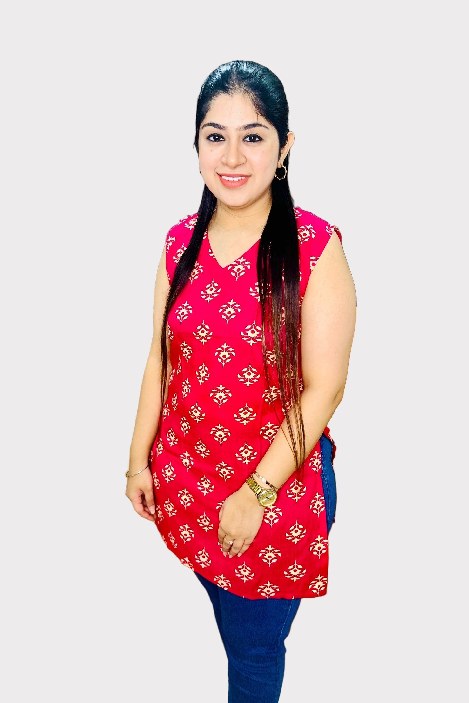 The Pink Bloom kurti combines comfort and style with its sleeveless design crafted from breathable cotton fabric. Ideal for both casual outings and office wear, it offers a polished look while keeping you cool throughout the day. Its versatile silhouette complements various accessories, making it a practical addition to your wardrobe for effortless elegance.